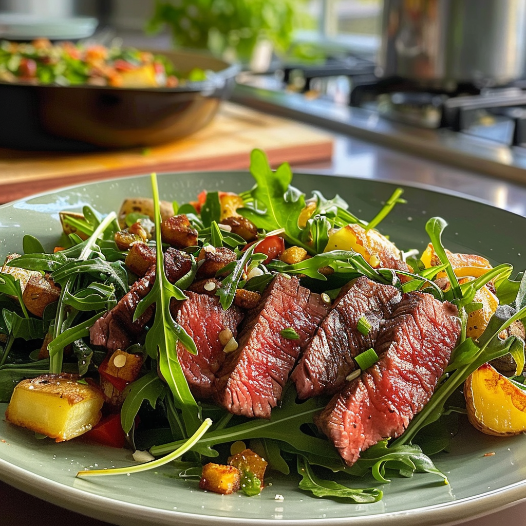 Start by marinating the skirt steak for at least 30 minutes. Then, cook the potatoes until golden and crispy while grilling the steak to your desired doneness. Finally, toss everything together on a bed of fresh arugula.