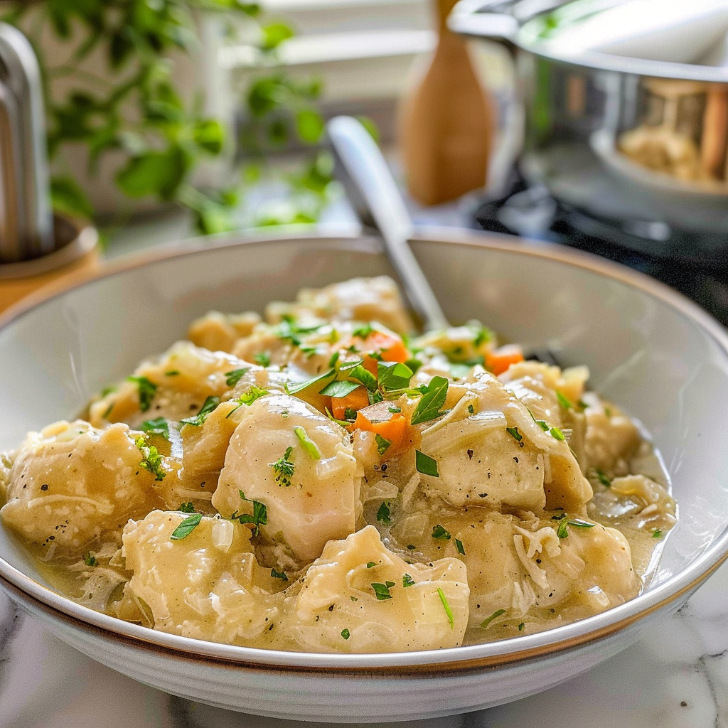 chicken recipe / comfort food / creamy broth / dumplings / easy dinner / family meal / slow cooker